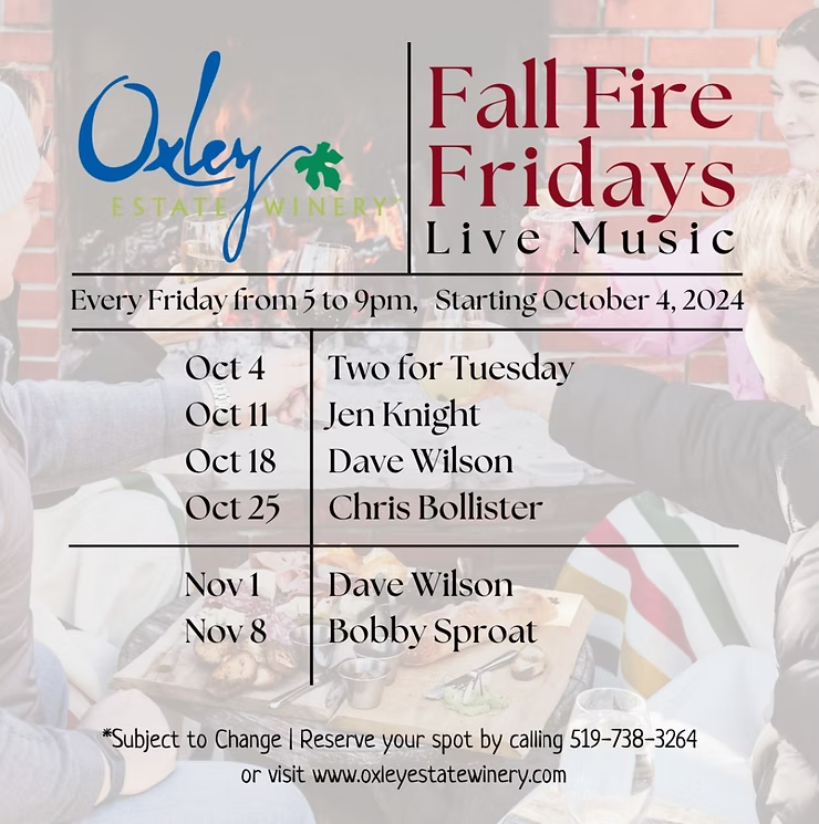 Reservations are required, so be sure to book your spot at www.oxleyestatewinery.com or call 519-738-3264.